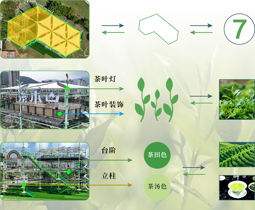整體造型:塔身高約20米,由16根錯落有致的茶湯色鋼結構立柱構成,整體框架上采用“7”字形布局,加入茶葉元素裝飾,以茶田色和茶湯色為主色調。