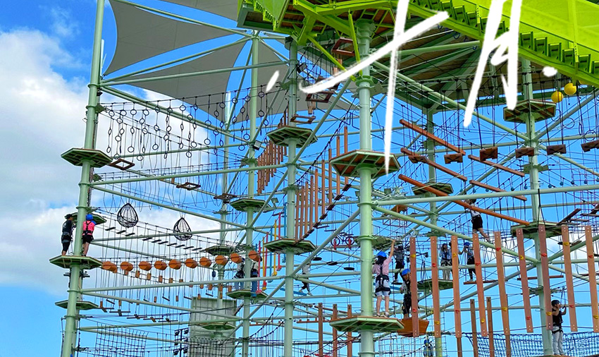 寧波“5號空間站-綜合探險水晶塔”,整塔高18m,共五層,設(shè)計有兒童步道、成人步道、攀巖、螺旋滑梯、低空蹦極和高空滑索等項目。