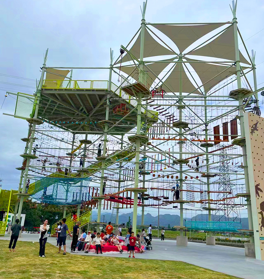 主塔外圍則設(shè)計有高空滑索、低空蹦極、螺旋滑梯、恐龍主題攀巖等特色項目。