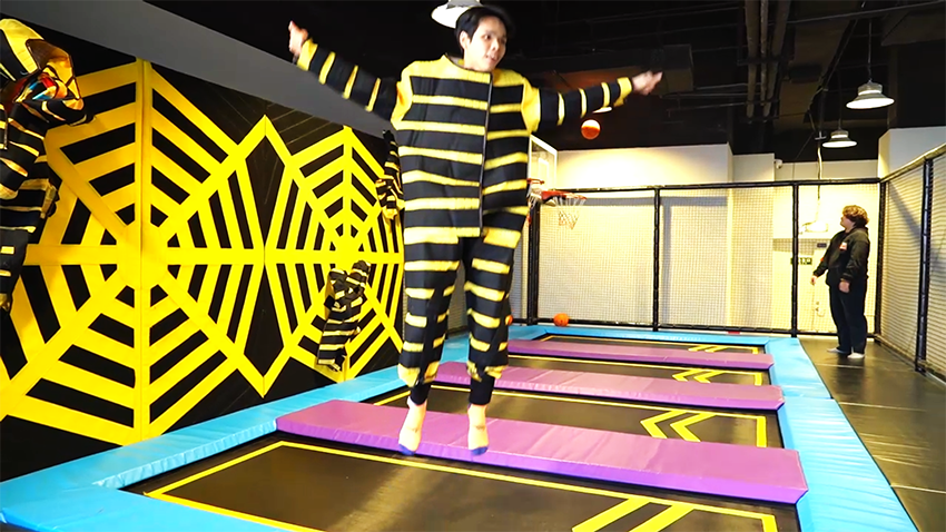 特制的衣服,通過蹦床的彈力,可以粘貼在覆蓋有魔術貼的墻壁上,從而實現“飛檐走壁”的體驗效果。