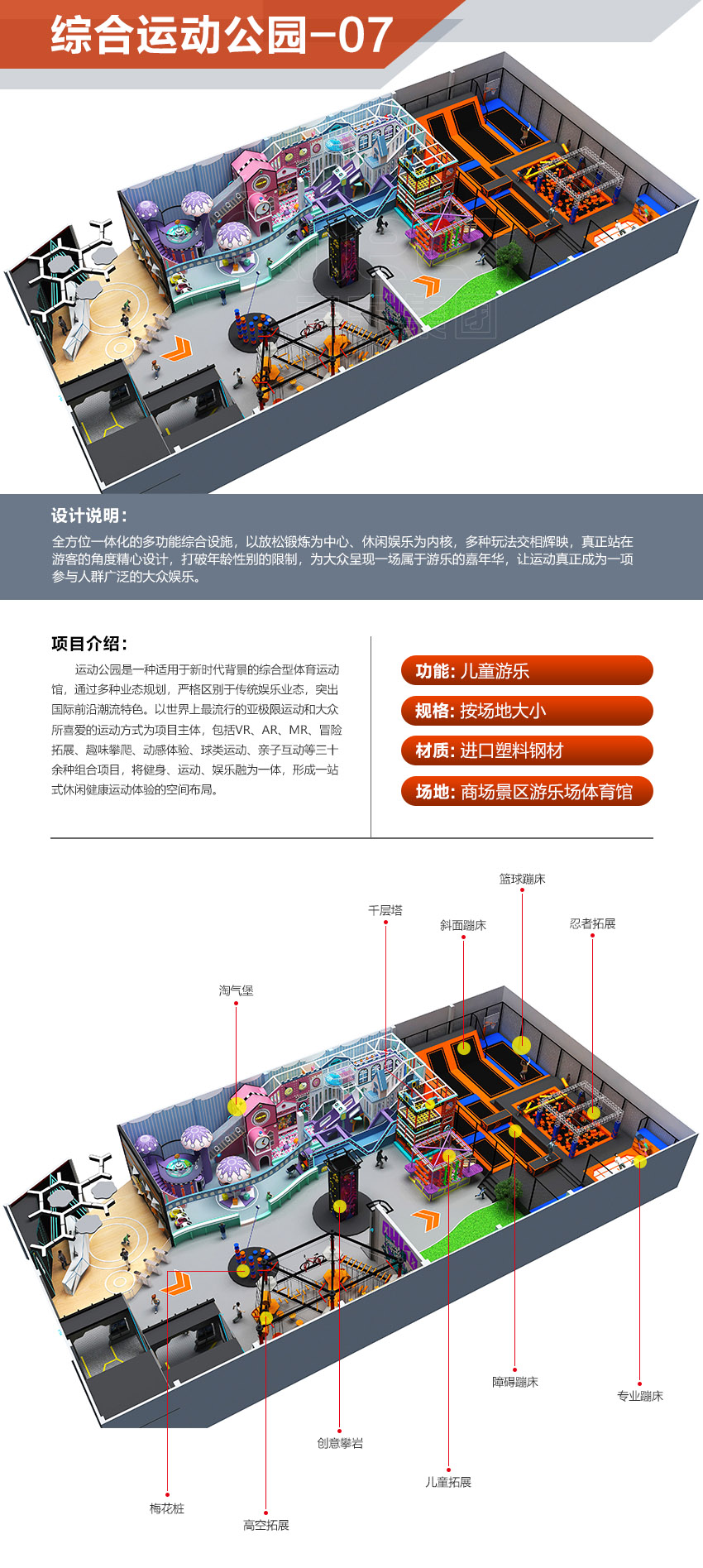 本項目適用于各種親子主題類的樂園,巧妙運用“熊貓”IP造型設計,集拓展、探險、滑道、飛索、蹦極、不銹鋼滑梯、攀巖、爬網(wǎng)等46種不同運動體驗的文化主題項目,結(jié)合“大灰熊”IP形象,融入相關設計元素,打造差異化的網(wǎng)紅IP主題性運動拓展營地綜合體。